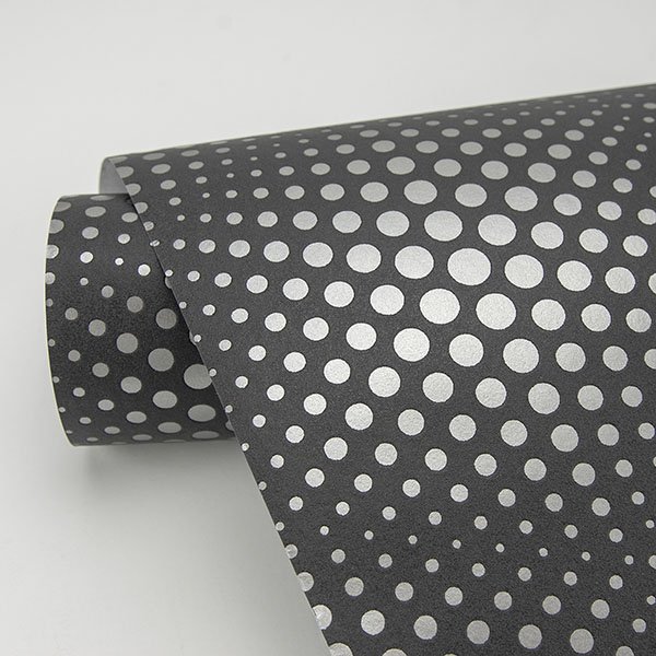 Enjoy the dynamic flair of this modern geometric wallpaper! Metallic silver circles grow and shrink in size against a dark grey backdrop to create the illusion of depth. Milo is an unpasted, non woven wallpaper.