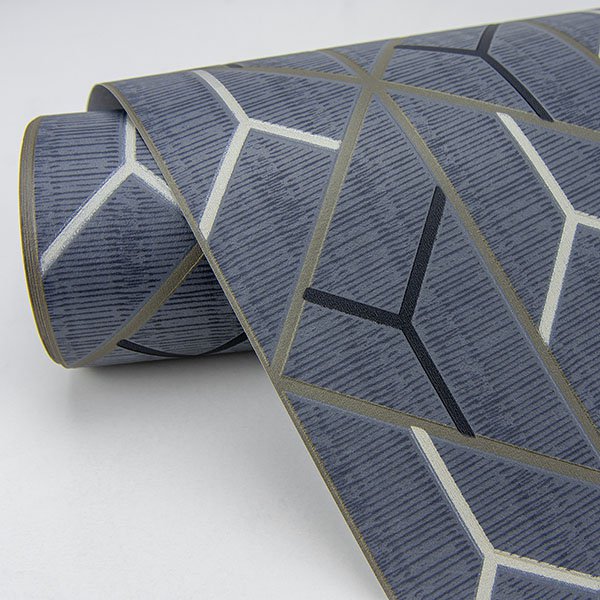 This rich geometric wallpaper is the perfect way to jazz up your interiors! The blue etched background is overlaid with a metallic geometric lattice, the framing triangles a sparkling pewter hue while the y-shaped insets alternate between shimmering silver and gunmetal. Wilder is an unpasted, non woven wallpaper.