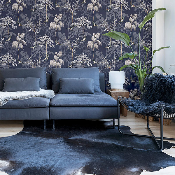 Sparrows flit between stately willows and cherry trees, depicted both in full color and as silhouettes along the backdrop. The birds are painted in pigmented black, red, and white, while the trees are shaped by soothing taupe and cream against a navy backdrop with pale blue silhouettes. Asuka is an unpasted, paper wallpaper measuring 20.9 inches wide by 33 feet long, covering approximately 57.5 square feet per roll. Colorway: Blue