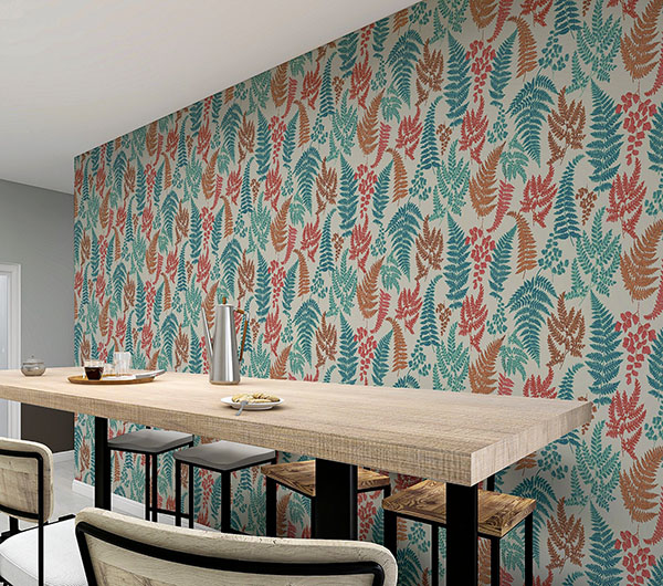 This whimsical woodland wallpaper features a variety of ferns and other woodland plants. Seen here in shades of red, terracotta, teal, and blue against eggshell. Jerome is an unpasted, paper wallpaper measuring 20.9 inches wide by 33 feet long, covering approximately 57.5 square feet per roll. Colorway: Red