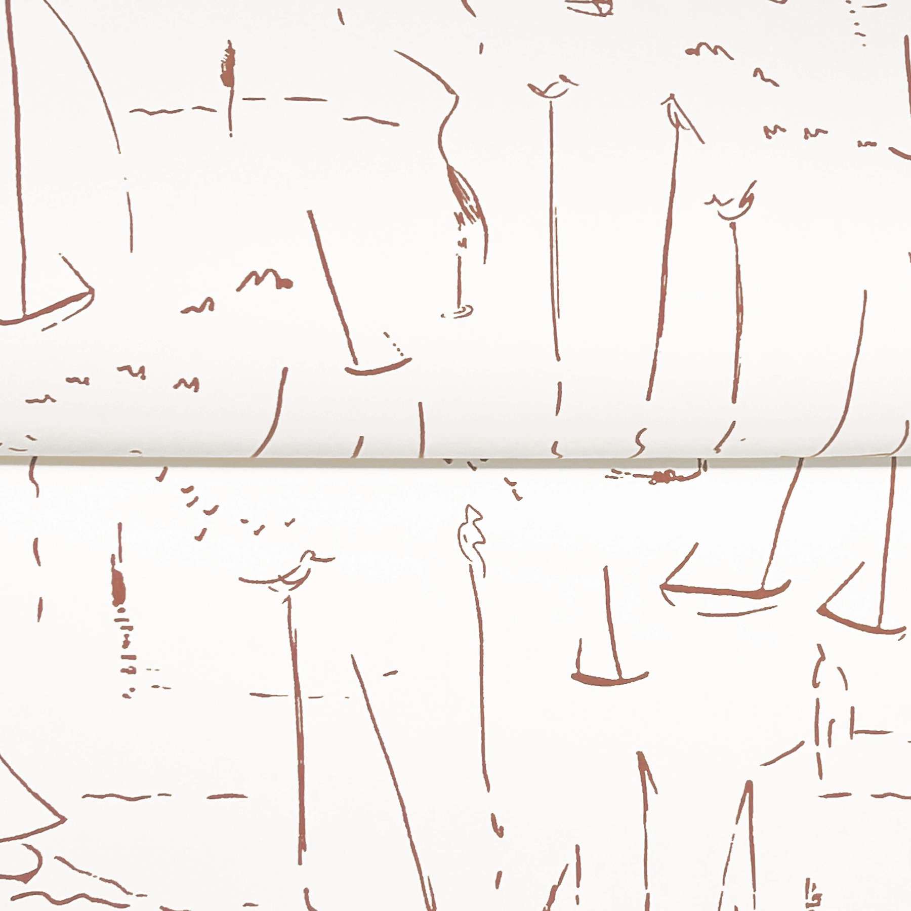 The minimalistic outlines of Vermillion Coast's seafaring sailboats offer a whimsical evolution of nautical themes. Featured here in terracotta. This Vermillion Coast Wallpaper measures approximately 27 inches wide by 27 feet long, measuring approximately 60.8 square feet per roll. Drawing inspiration from the gestural fluidity of turn of the century artwork, Artisan Studio offers an exploration of color, abstraction, and organic forms.