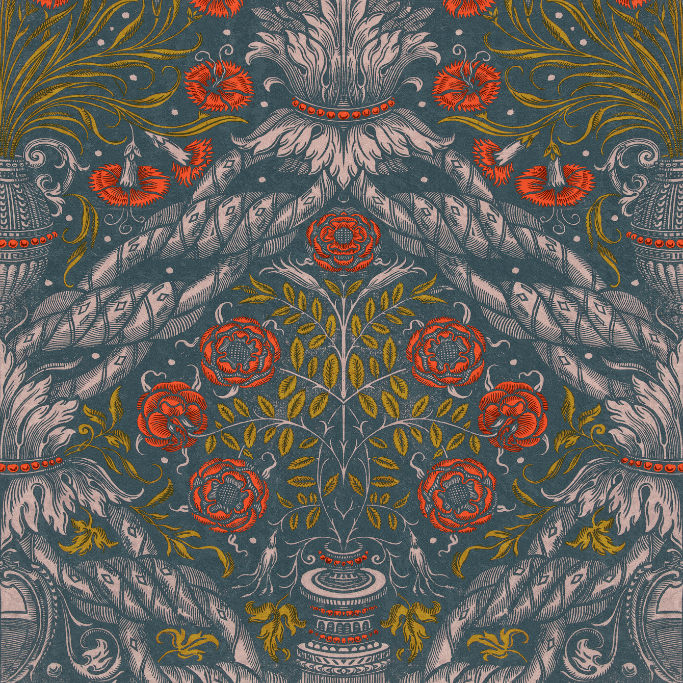 A wallpaper masterpiece design with stunning birds of Paradise illustrated on a idilic background full of blooming branches. A rich coloured design with beautiful details made on 3 rolls. Available on two different colour options - Green Sheen and Grey - and also as a home fabric printed on English cotton pile velvet.