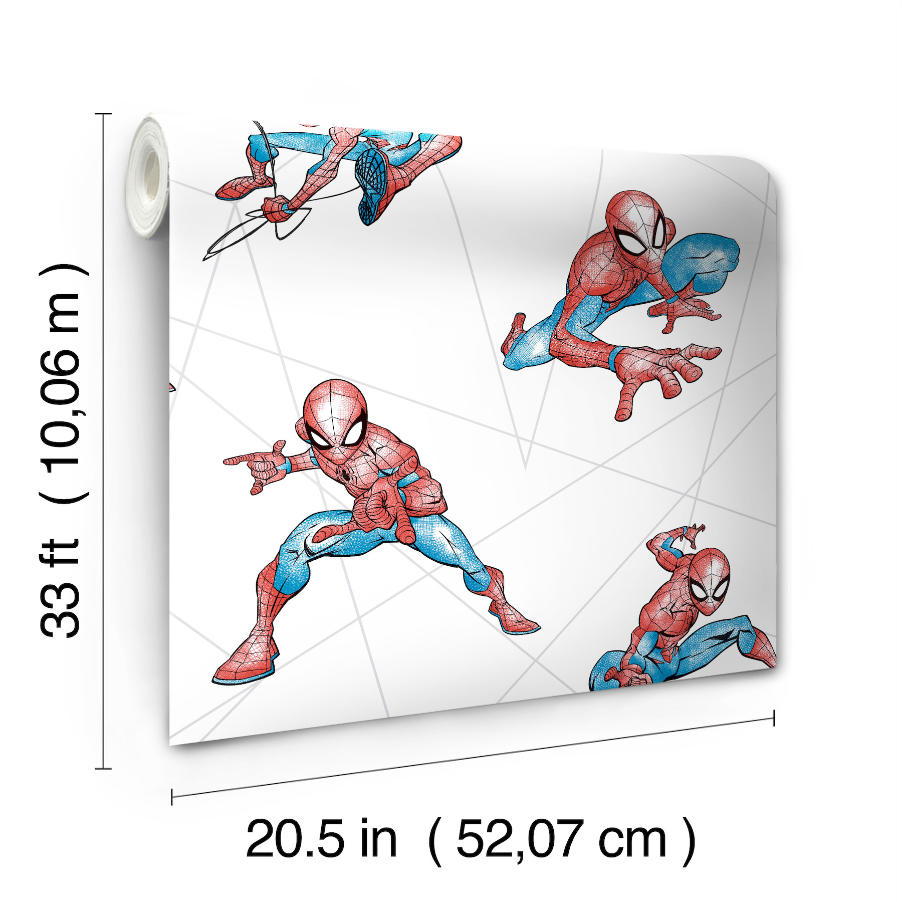 This colorful pattern is sure to add high impact to your kids space. This Spider-Man Fracture Wallpaper measures approximately 20.5 inches wide by 33 feet long, covering About 56.4 square feet per roll. Durable and easy to remove from primed walls, this friendly to hang unpasted nonwoven wallpaper is created with a special blend of synthetic fibers, making it both easy to hang and tear resistant. Colorway: Blue & Grey