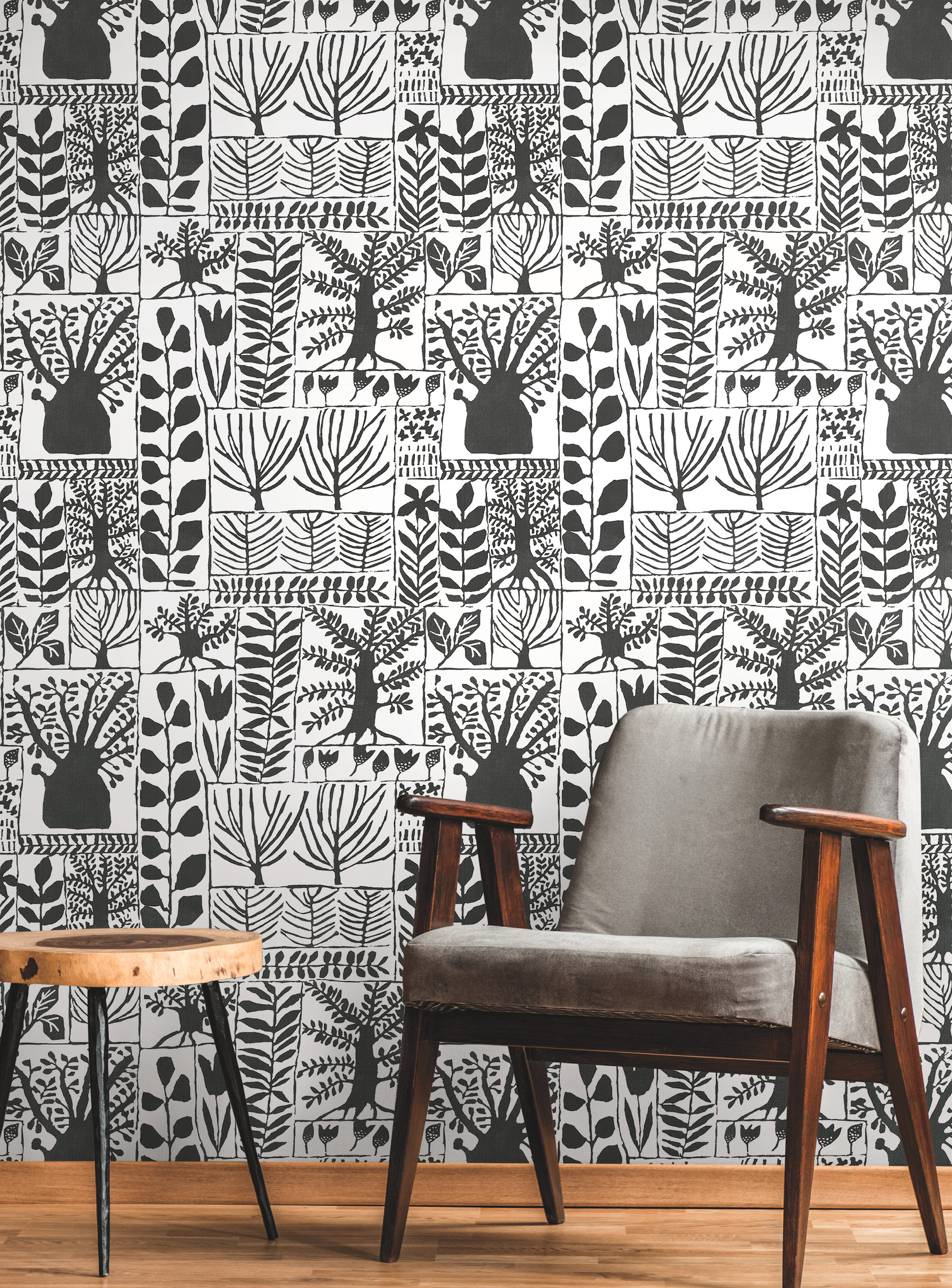 Instinctively simple tribal art themes create the feeling of Primitive Trees’ modern, natural pattern. This Primitive Trees Wallpaper measures approximately 27 inches wide by 27 feet long, covering About 60.8 square feet per roll. Manufactured on Sure Strip™, a unique high performance substrate, this ultra-easy removable wallpaper is guaranteed easy to install and easy to remove; simply use water to activate. Colorway: Black & White