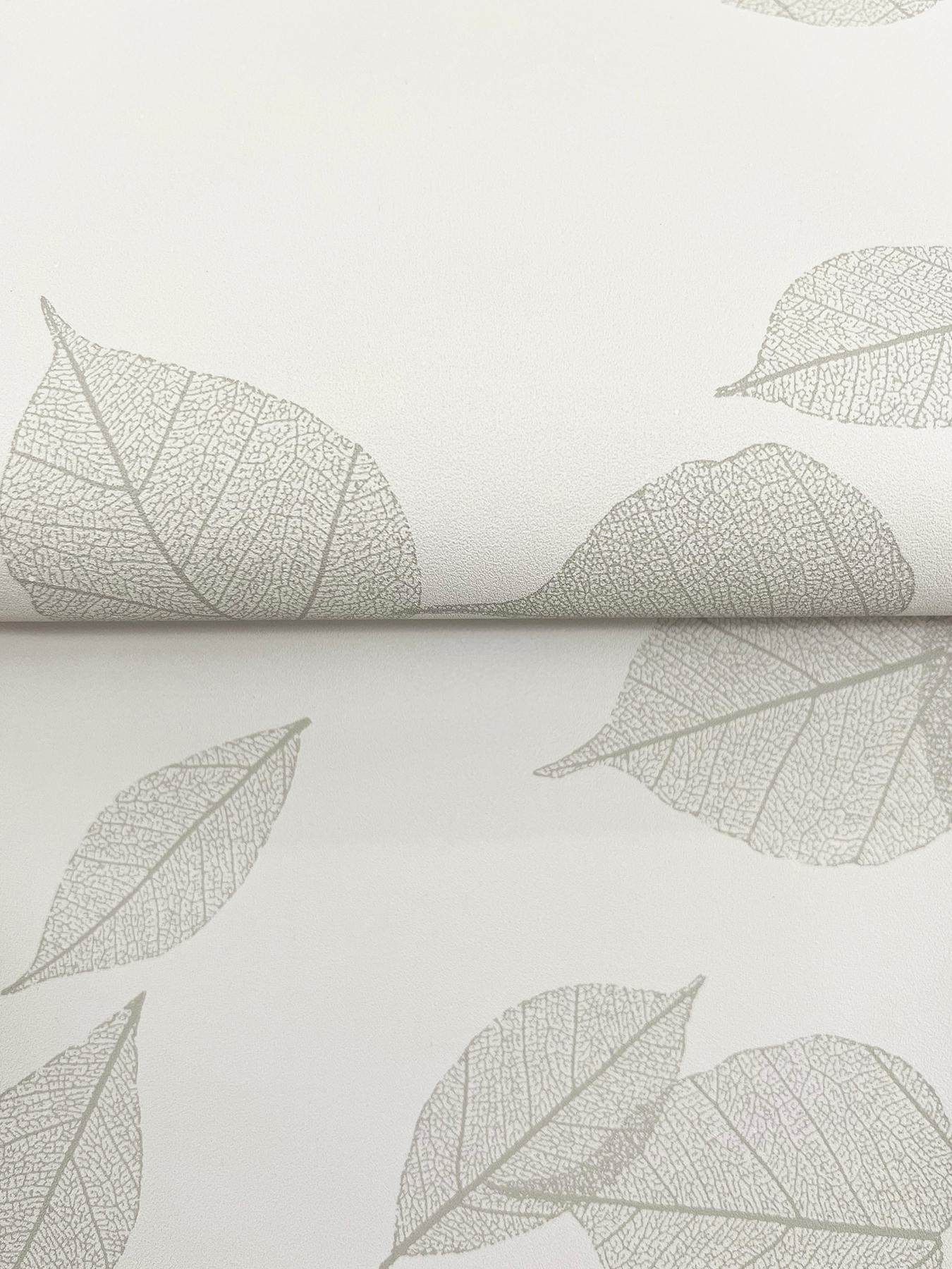 The veined, semi-transparent leaves of late fall drift downwards in this elegant botanical wallpaper. Featured here in a palette of grey against pale grey. Myles is an unpasted, non woven wallpaper measuring 27 inches wide by 27 feet long, covering approximately 60.8 square feet per roll.