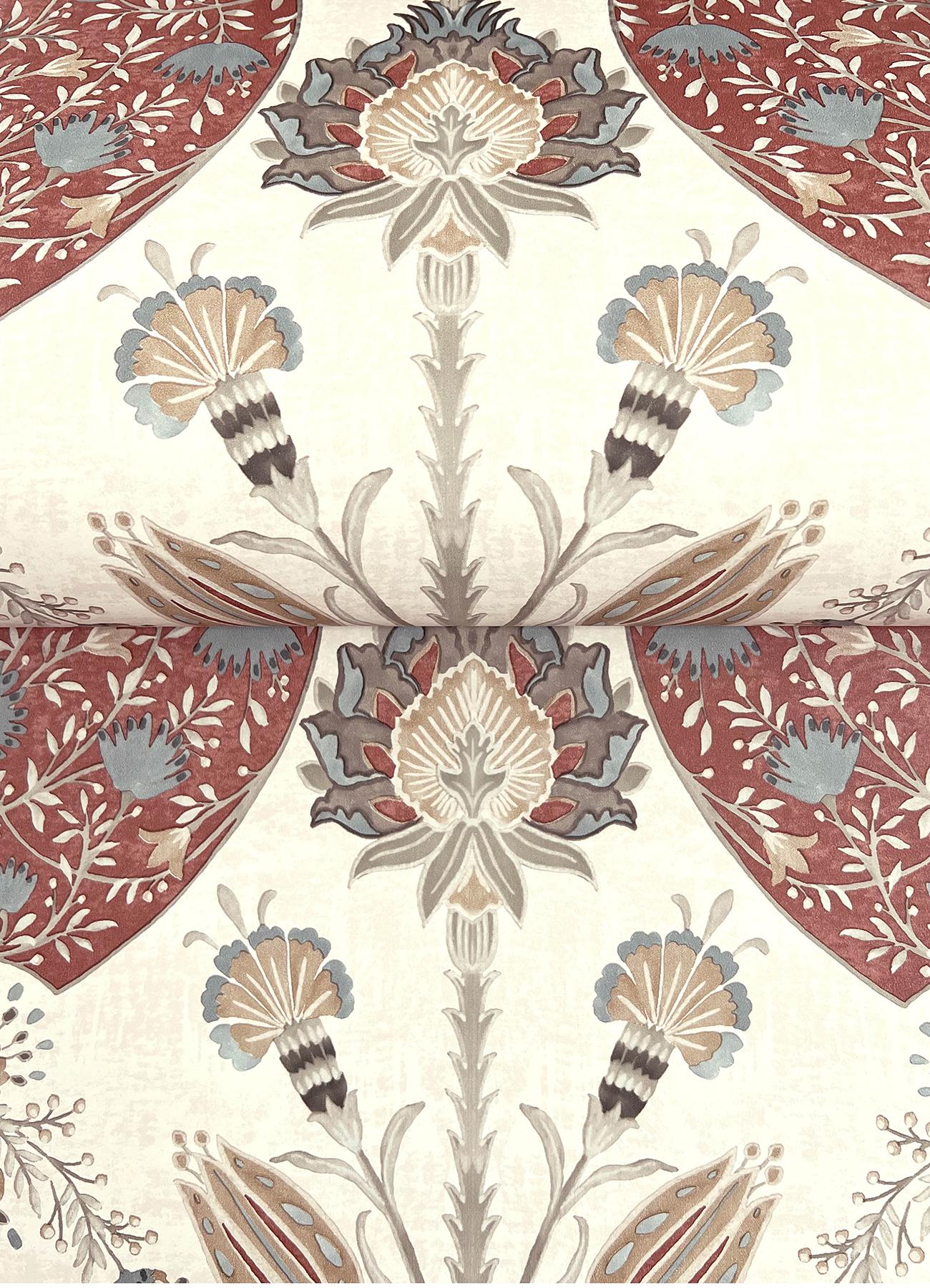 This spectacular floral ogee showcases an impressively scaled design alternating between panels bedecked in floral vines and segments illustrating the full, rooted flower. Pictured here in ruby red and cream accented by golden ochre, powder blue, and mossy green. Auden is an unpasted, non woven wallpaper measuring 20.5 inches wide by 33 feet long, covering approximately 56.4 square feet per roll.