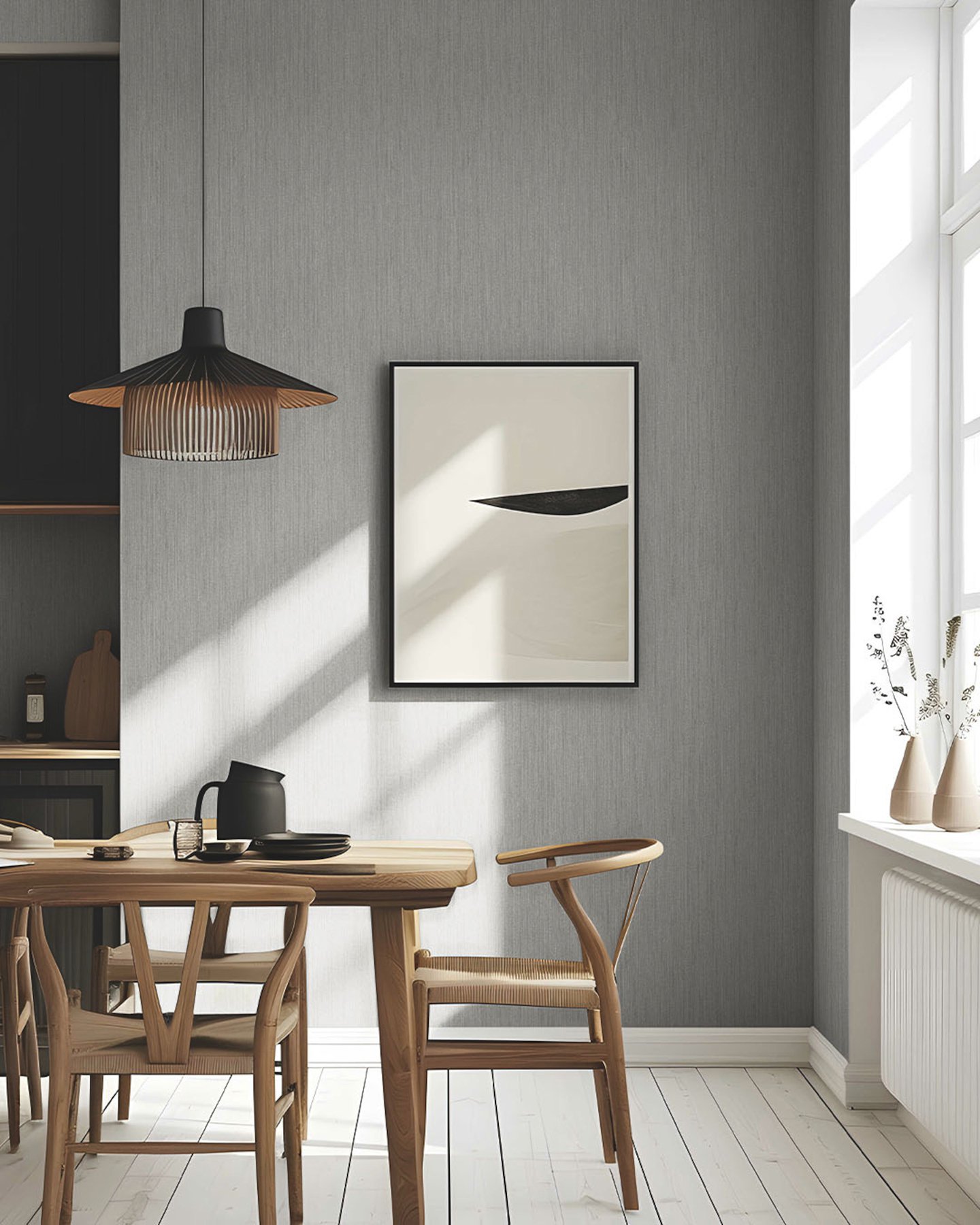 The textile inspired wallpaper Midolin has a vertical woven structure that, when sunlight dances across the surface, reveals the subtle interplay between shadow and light along the wall. Seen here in a rich, deep brown. Midolin Bark is an unpasted, non woven wallpaper measuring 20.9 inches wide by 33 feet long, covering approximately 57.5 square feet per roll.
