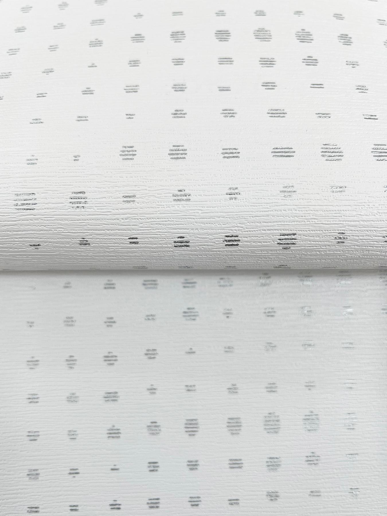 Polka dots enjoy an elevated update with dots of multiple sizes formed from individual strokes of silver ink along a textured, cool white backdrop. Brielle is an unpasted, non woven backed vinyl wallpaper measuring 27 inches wide by 27 feet long, covering approximately 60.8 square feet per roll.