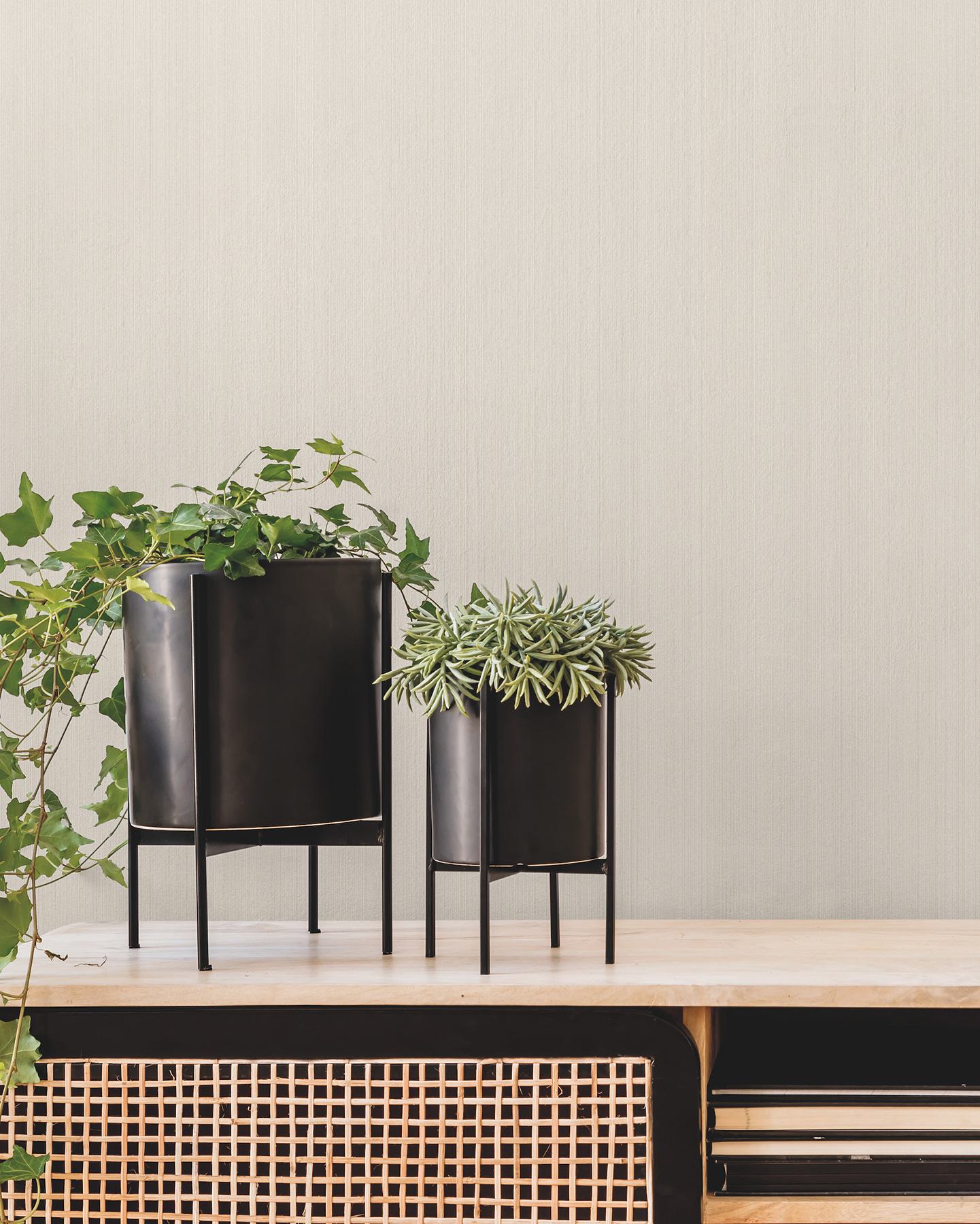 Thin vertical bands bring texture and sophisticated dimension to this monotone wallpaper. Featured here in vanilla. Warren is an unpasted, non woven backed vinyl wallpaper measuring 27 inches wide by 27 feet long, covering approximately 60.8 square feet per roll.