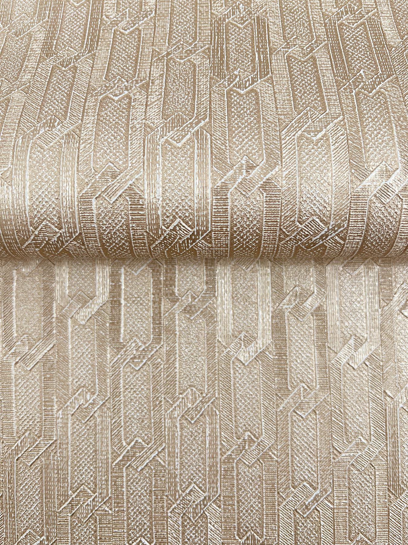 This modern geometric wallpaper features hexagon links forming long chains along a textured backdrop. Seen here in unvarnished brass. Wesley is an unpasted, fabric backed vinyl wallpaper measuring 54 inches wide by 90 feet long, covering approximately 405 square feet per roll.