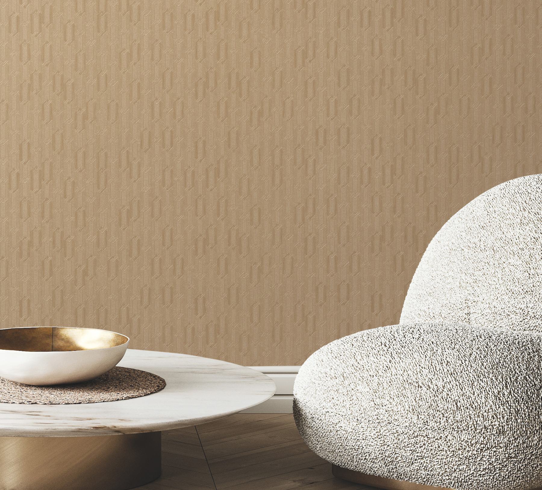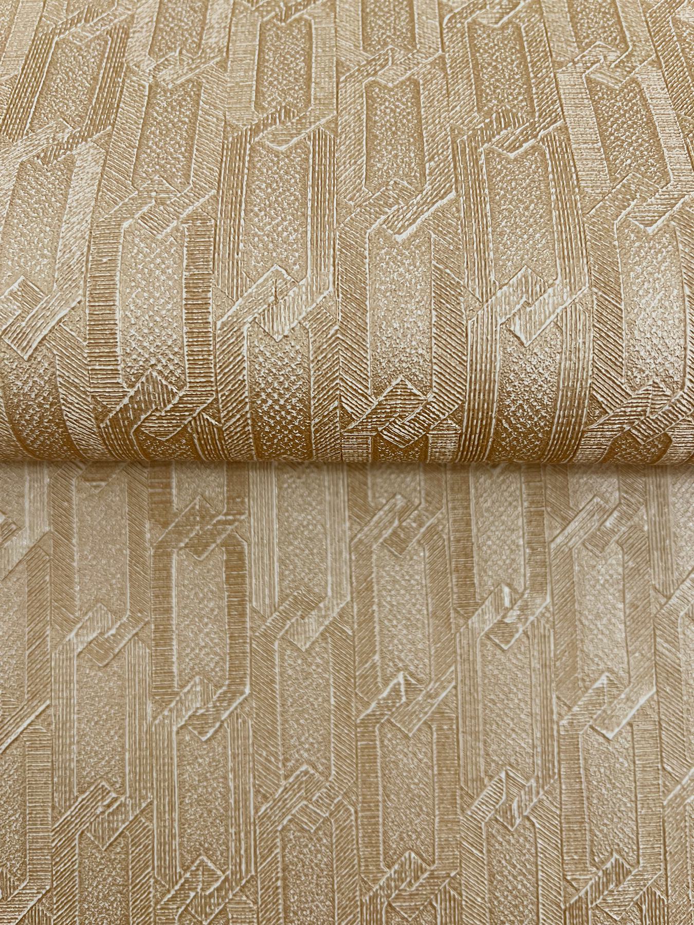 This modern geometric wallpaper features hexagon links forming long chains along a textured backdrop. Seen here in rich bronze. Wesley is an unpasted, fabric backed vinyl wallpaper measuring 54 inches wide by 90 feet long, covering approximately 405 square feet per roll.