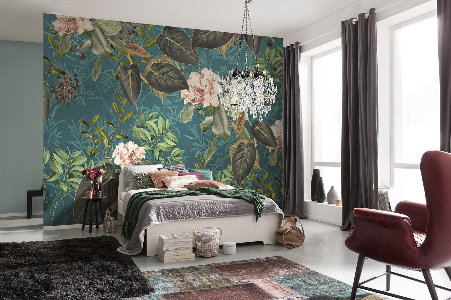 A combination of tropical botanicals and florals combine to create this vibrant, folksy mural. The saturated green and brown hues atop the deep teal backdrop brings vibrant energy to your space. Teal Tropic Wall Mural comes on 7 panels. Measures 11-ft 5-in wide by 8-ft 2-in tall when assembled.