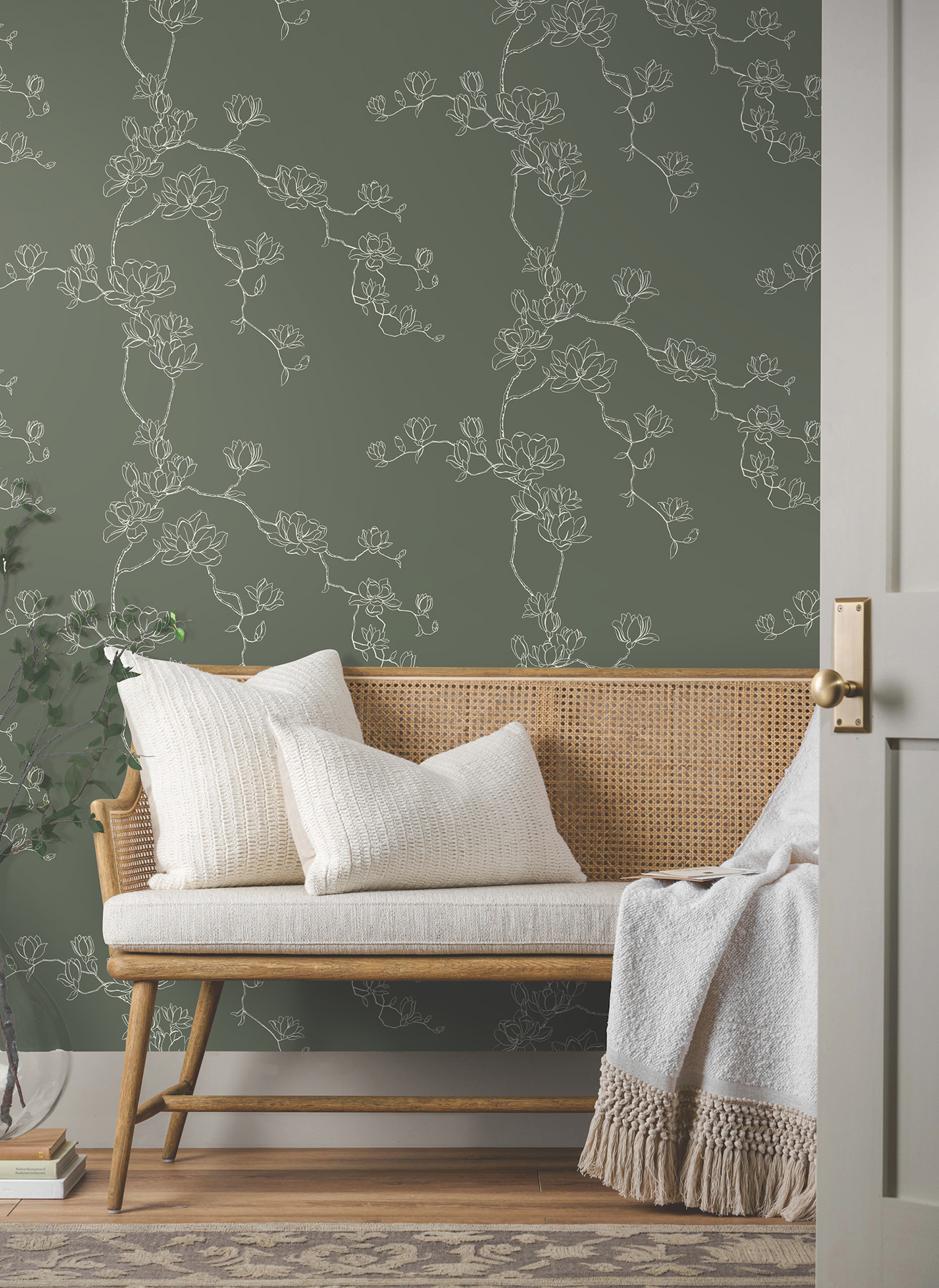 Delicate branches laden with lush magnolia blooms are outlined in white against evergreen to showcase the bloom’s light, simple beauty. This Magnolia Branches Wallpaper measures approximately 27 inches wide by 27 feet long, measuring approximately 60.8 square feet per roll. This collection of timeless wallcoverings is layered with warmth and charm, and effortlessly blends nostalgic patterns with modern designs. This assortment has a little bit of everything—simple stripes, subtle plaids, vintage motifs, and bold florals.