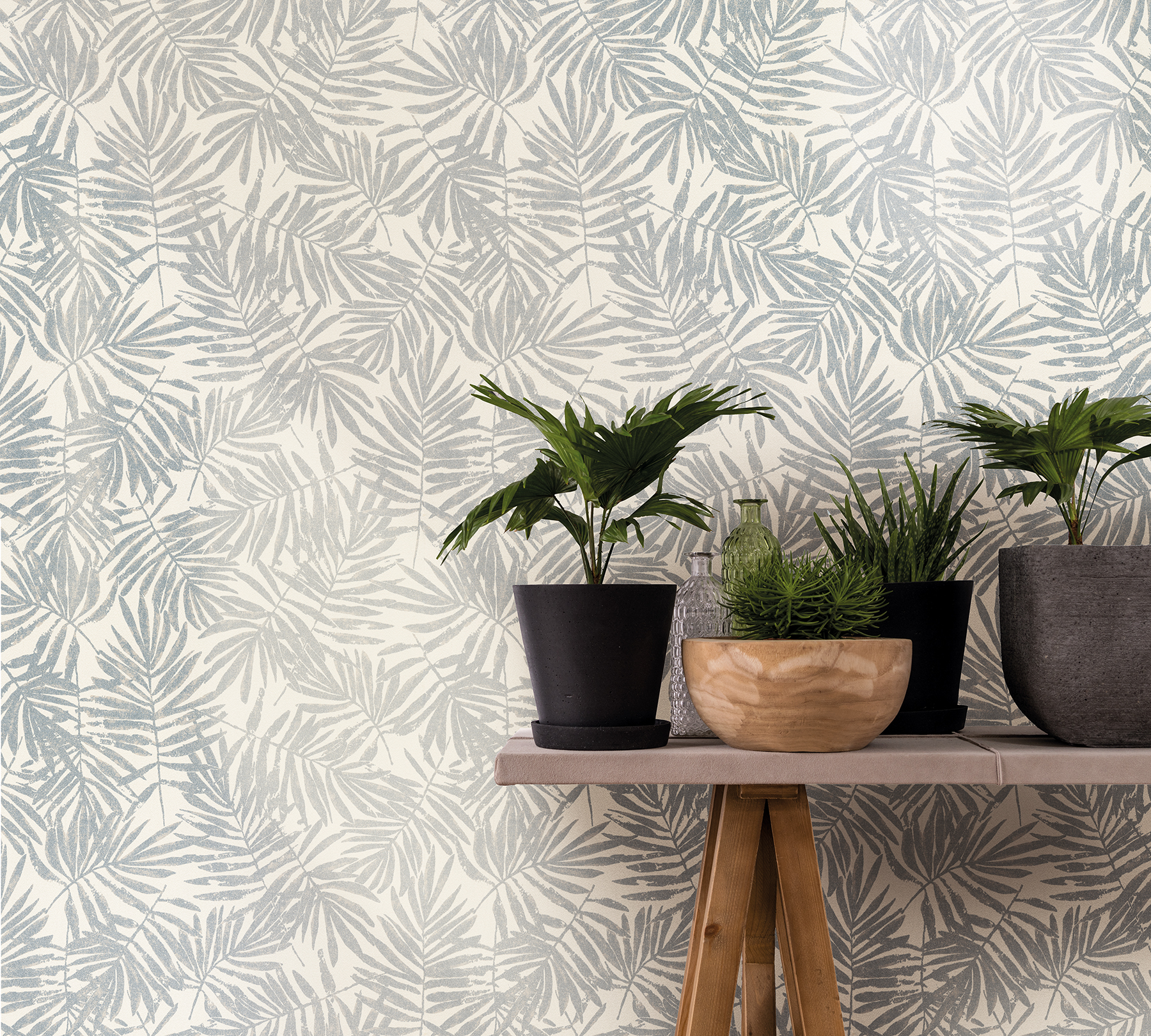 This chic palm print will have you dreaming of the beach with its soothing design. With soft gray and cream hues, this wallpaper has a tropical energy. La Veneziana is an unpasted, non woven wallpaper.
