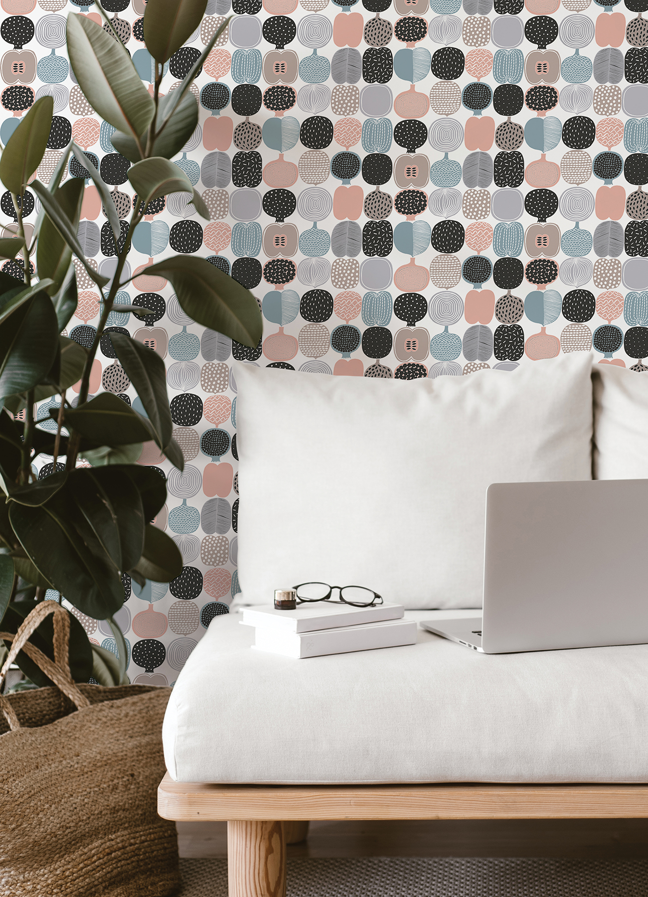 From afar, this peel and stick wallpaper appears to be a dotted pattern, but in fact is a cornucopia of fruit and style! Marimekko's graphic design features pink, blue, grey, and black hues that will add a unique look to your walls. Pink and Grey Kompotti Peel and Stick Wallpaper comes on one roll that measures 20.8 inches wide by 18 feet long. Colorway: Pink and Grey