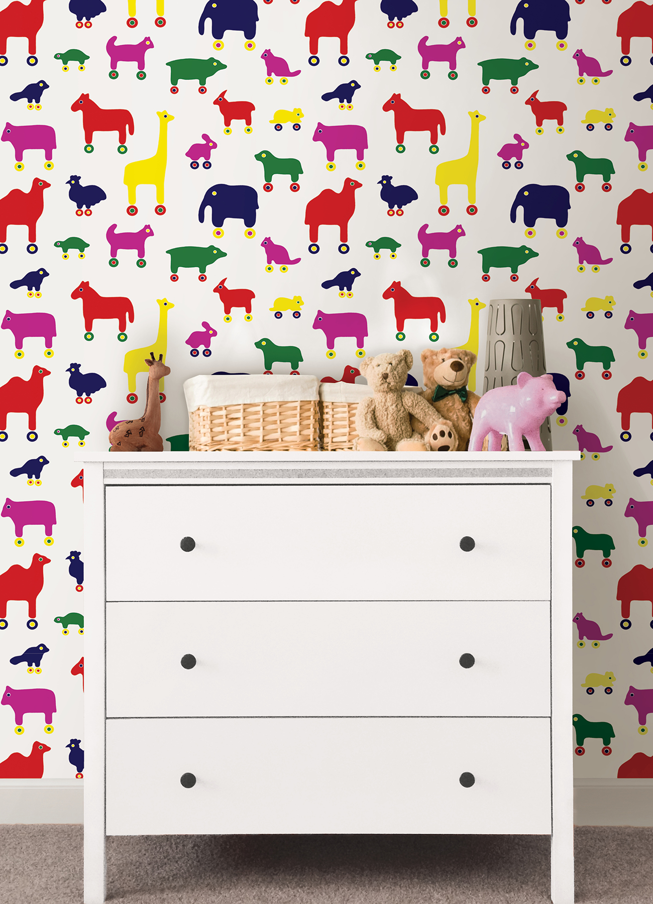 Bring color and joy into any room with this whimsical peel and stick wallpaper by Marimekko! This adorable pattern features elephants, giraffes, rabbits and more racing around on wheeled feet. Multi Rulla Peel and Stick Wallpaper comes on one roll that measures 20.8 inches wide by 18 feet long. . Colorway: Multi
