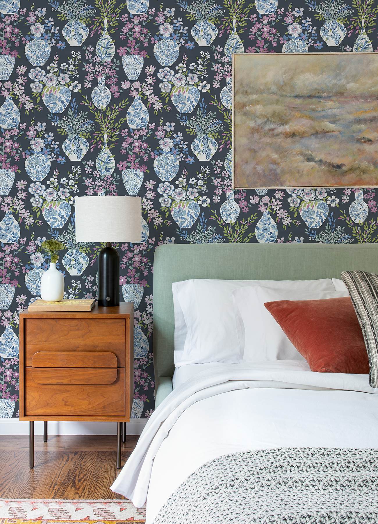 This painterly floral design celebrates both garden blooms and ceramics. The blue and white vases are bursting with bouquets of lilac, purple, blue, green and cream flowers, all richly offset by a charcoal grey backdrop. Harper is an unpasted, non woven wallpaper.