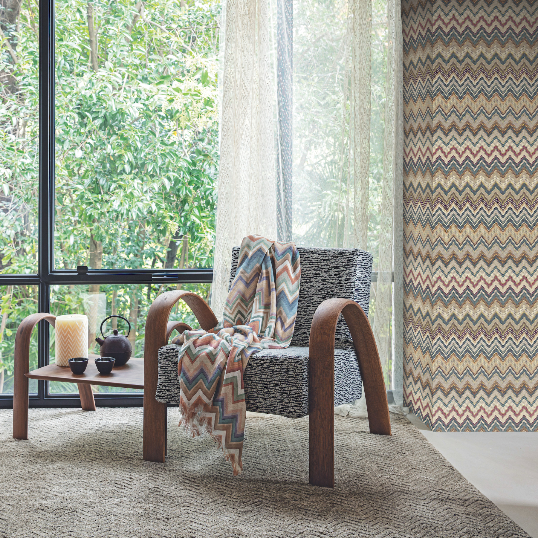 The textural pattern Happy Zigzag emulates the iconic chevron patterns of the couturier Missoni fashion house. This Happy Zigzag Wallpaper measures approximately 39.3 inches wide by 33 feet long, covering About 108.1 square feet per roll. Durable and easy to remove from primed walls, this friendly to hang unpasted nonwoven designer wallpaper is created with a special blend of fibers, making it both washable and tear resistant. Colorway: Green & Brown