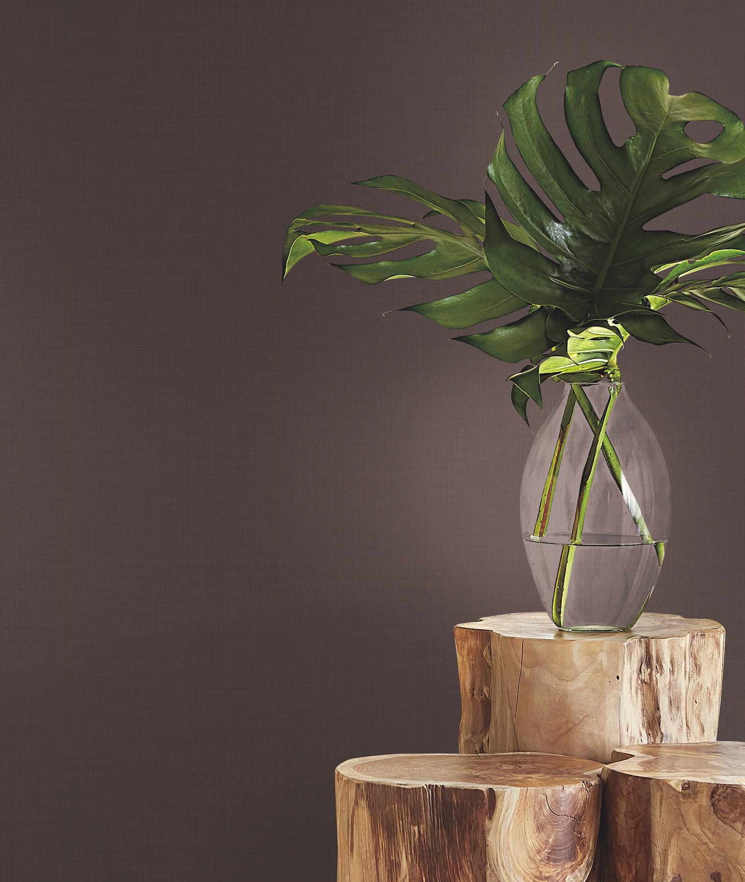 This chic faux fabric wallpaper perfectly mimics linen's woven splendor. Pictured here in deep burgundy. Evermore is an unpasted, fabric backed vinyl wallpaper measuring 27 inches wide by 27 feet long, covering approximately About 60.8 square feet square feet per roll.