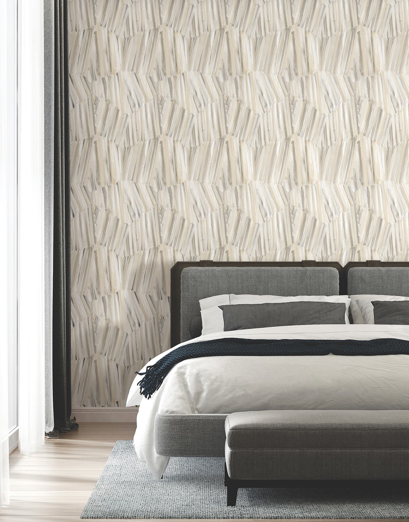 Bold brushstrokes create a complex and abstracted tapestry accentuated by the occasional metallic streak. Seen here in a palette of beige, taupe, white, and polished steel blue. Masterwork is an unpasted, mylar wallpaper measuring 50.5 inches wide by 30 feet long, covering approximately About 126.3 square feet square feet per roll.