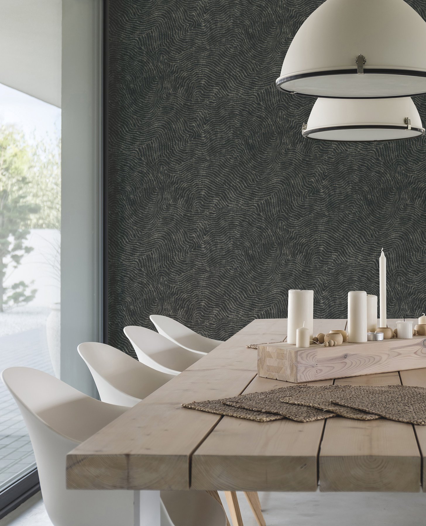 Tree rings and woodgrain becomes a sinuous story of today’s romance with natural Modern Wood when combined with touches of raised metallic, shown in raven black. This Modern Wood Wallpaper measures approximately 27 inches wide by 27 feet long, measuring approximately 60.8 square feet per roll. The modern aesthetic of natural form. Colorway: Black