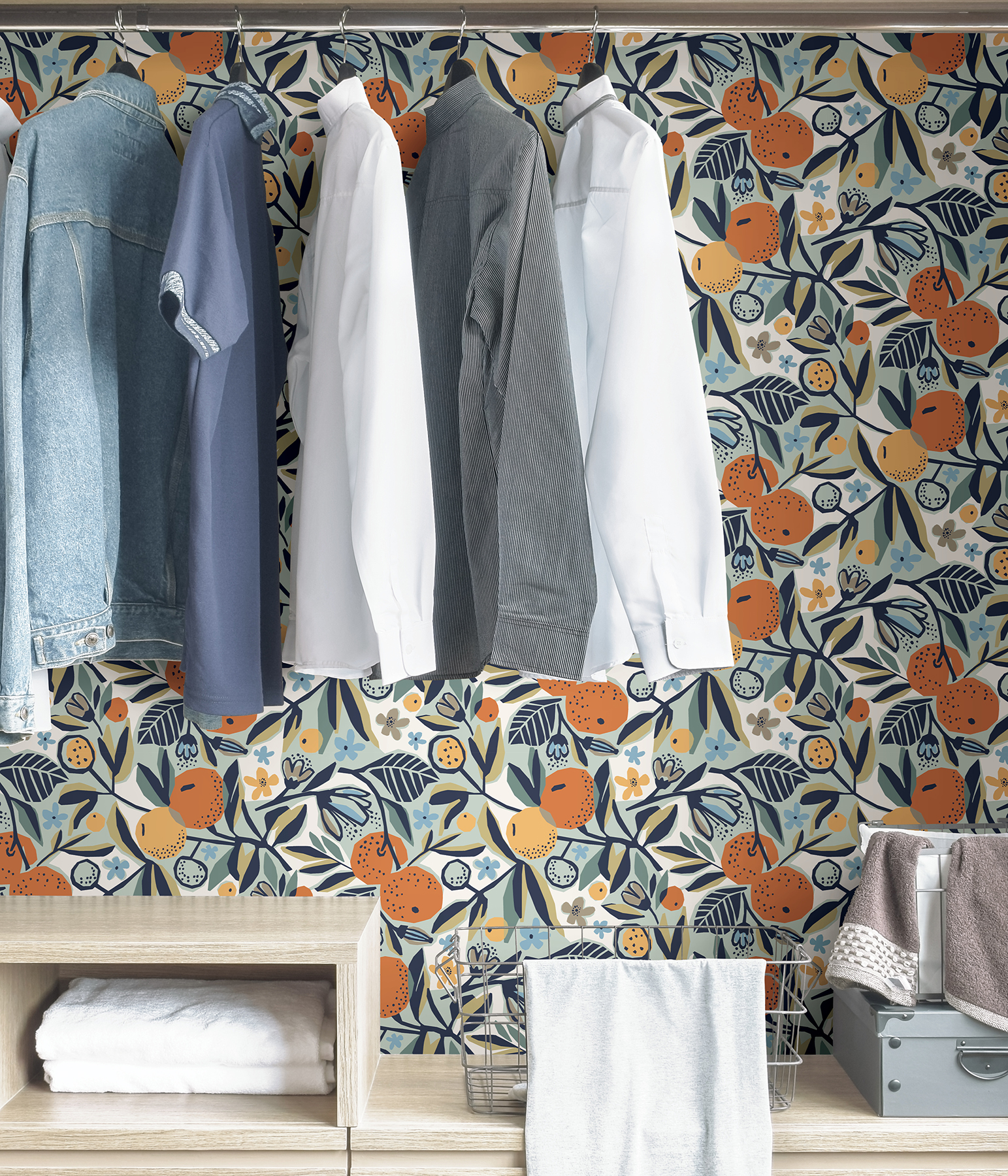 Bring eclectic charm to your walls with this watercolor design. Orange clementines take center stage in this citrus themed peel and stick wallpaper, the fruit framed by branches of navy leaves. Navy Clementine Garden Peel and Stick Wallpaper comes on one roll that measures 20.5 inches wide by 18 feet long. Colorway: Navy