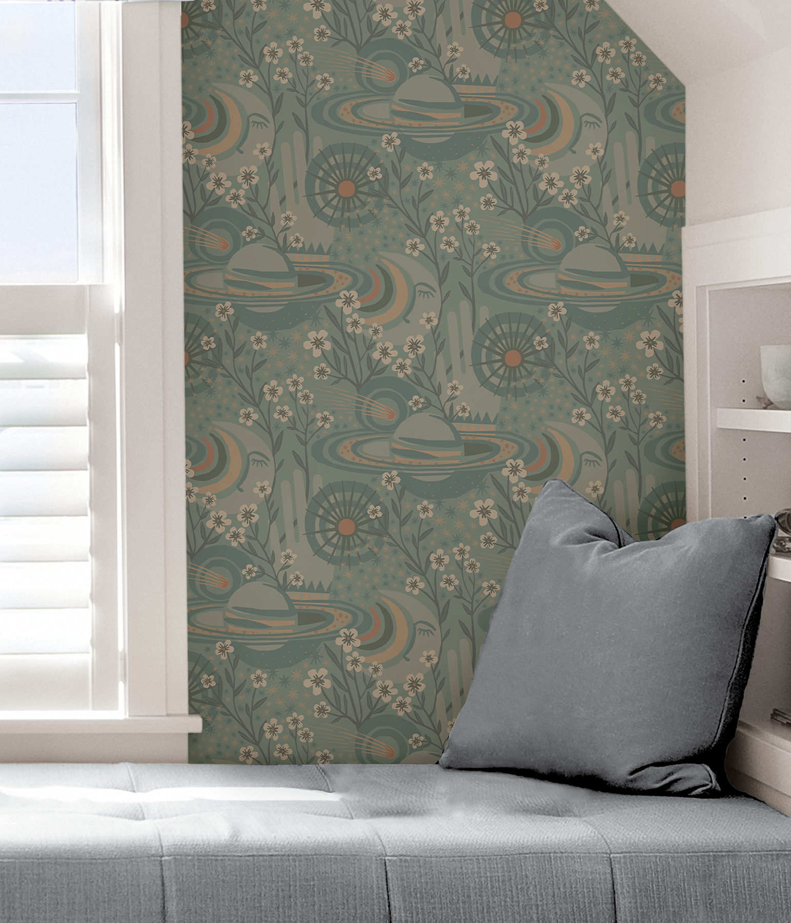 Travel to the Milky Way and back without ever leaving your bedroom or living area with this celestial wallpaper. Its teal hues and muted orange accents will give your walls a relaxing and cosmic look. Teal Ethereal Cosmos Peel and Stick Wallpaper comes on one roll that measures 20.5 inches wide by 18 feet long. Colorway: Teal