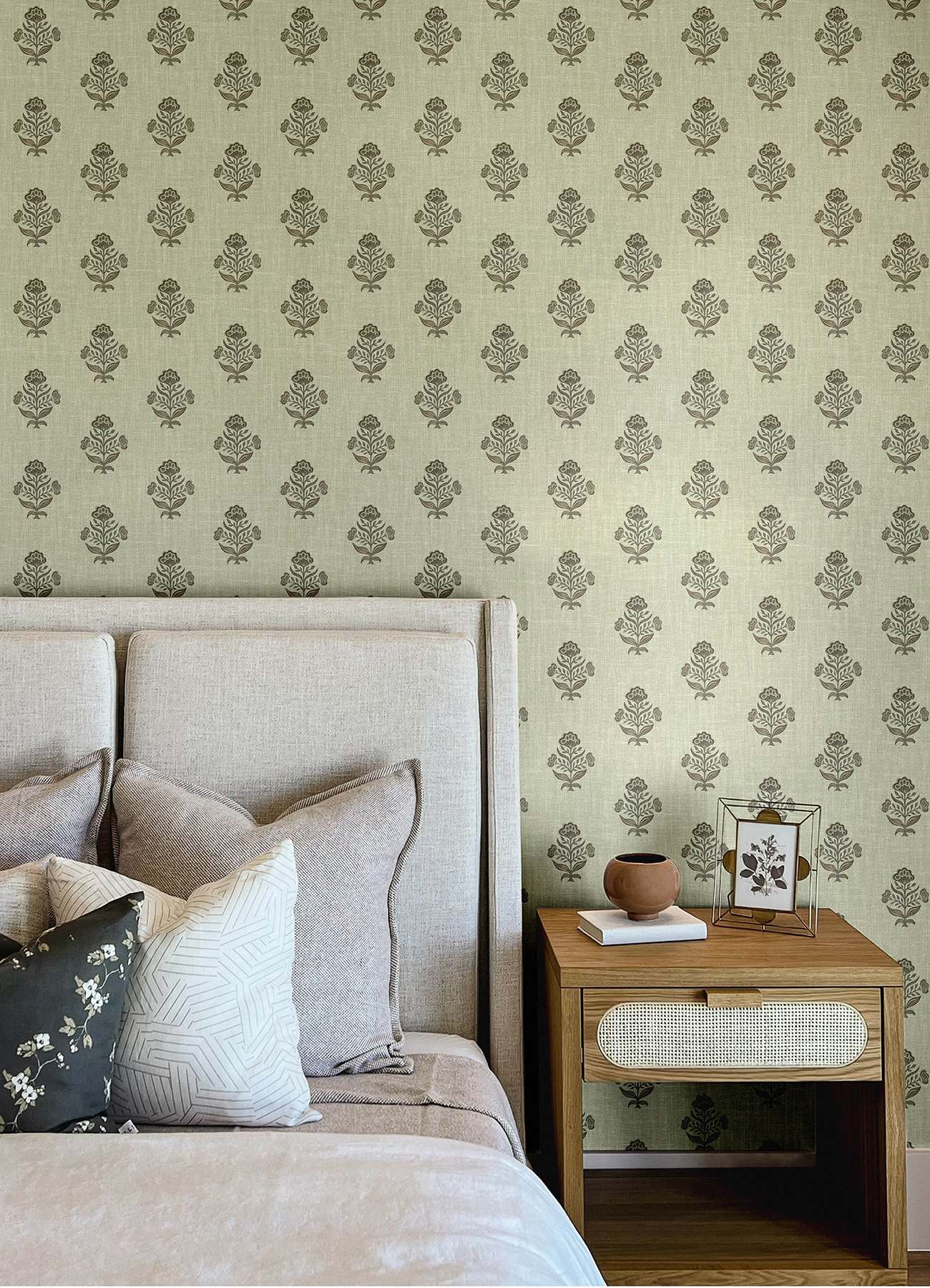 Simply crafted, this tri-bloom floral crest looks as if it was hand-stamped using moss, brown, and black inks along finely-loomed green linen. Hollyhock is an unpasted, non woven wallpaper measuring 20.5 inches wide by 33 feet long, covering approximately 56.4 square feet per roll.