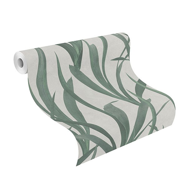 This simple and sophisticated botanical wallpaper will transport you to the riverbank. Large, grass-like reeds sway against a soft grey backdrop. Amarna is an unpasted, vinyl wallpaper.