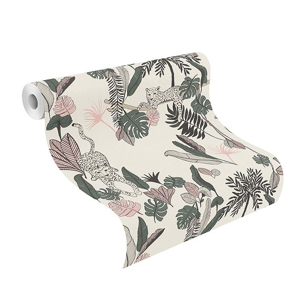 Enjoy this high-fashion take on jungle sophistication with this wallpaper. Stylized jaguars lounge among the tropical foliage colored in delicate shades of pink and green against an off-white background. Tadoba is an unpasted, vinyl wallpaper.