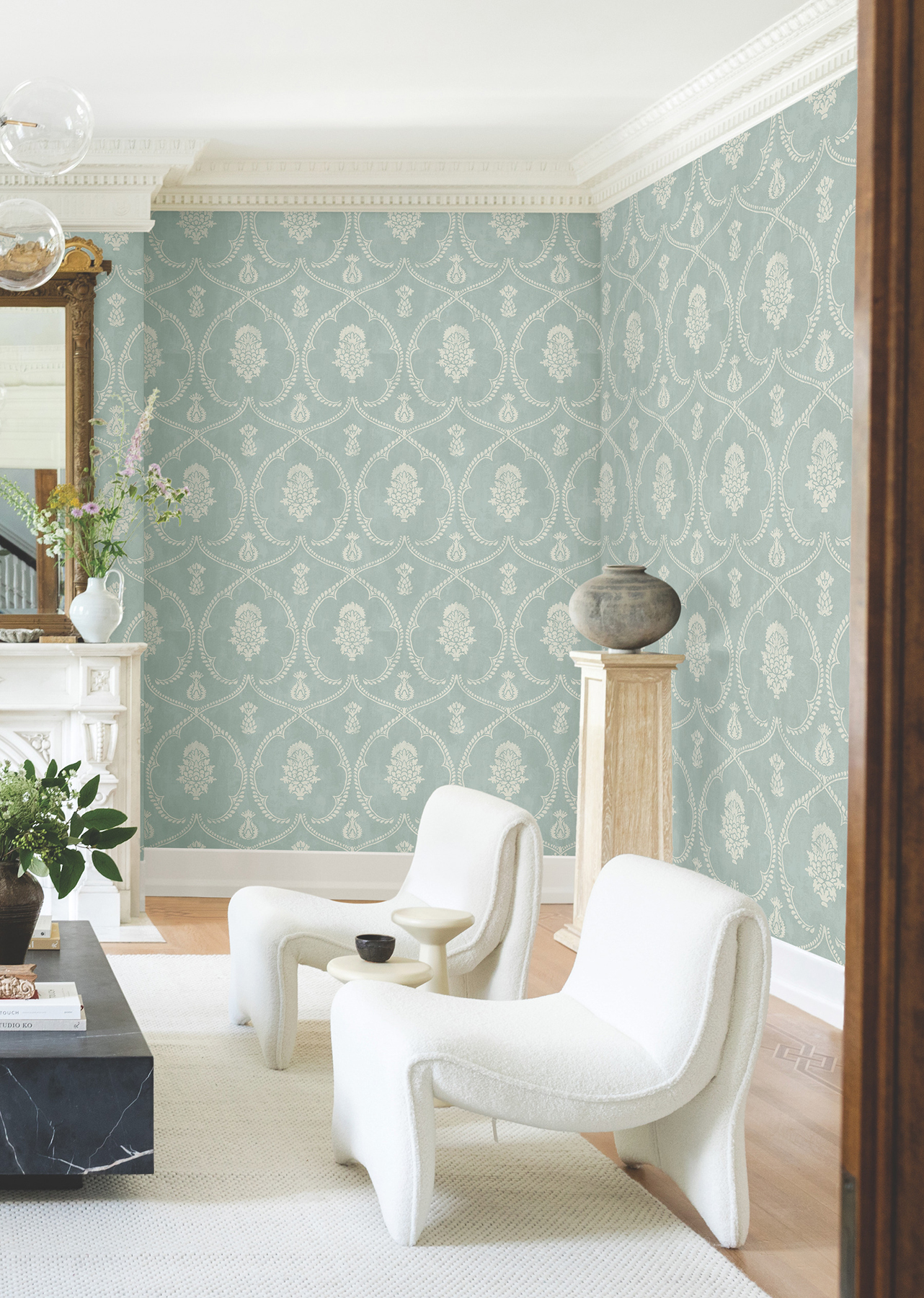 Petite and grand botanical medallions are encircled by swooping frames embellished with simple leaves in pattern Royal Damask. Seen here in a palette of sea green and white. This Royal Damask Wallpaper measures approximately 27 inches wide by 27 feet long, measuring approximately 60.8 square feet per roll. Traditional and timeless meets modern refinement, with artfully crafted designs redefined in striking color palettes. Colorway: Jade