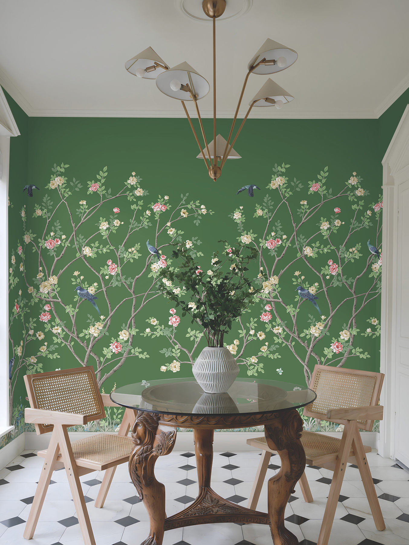 Asian motifs and Japanese gardens define the timeless beauty of the Lingering Garden Mural, shown here in verdant green with white, blue and pink accents. This Lingering Garden Wall Mural contains 2 panels that each measure 33.25-in wide, measuring approximately 5.5-ft wide by 10.2-ft tall when assembled. The distinction of timeless style.