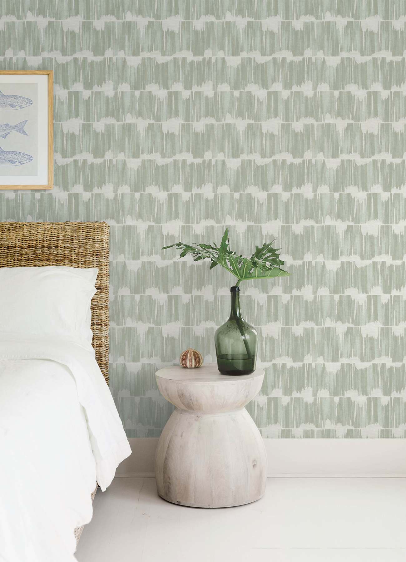This dynamic wide stripe has it all: dimension, texture, and subtle pearlescent touches. A fan favorite design revitalized in a new colorway featuring a blend of sage, aqua, ivory, and white. Serendipity is an unpasted, non woven wallpaper measuring 20.5 inches wide by 33 feet long, covering approximately 56.4 square feet per roll.