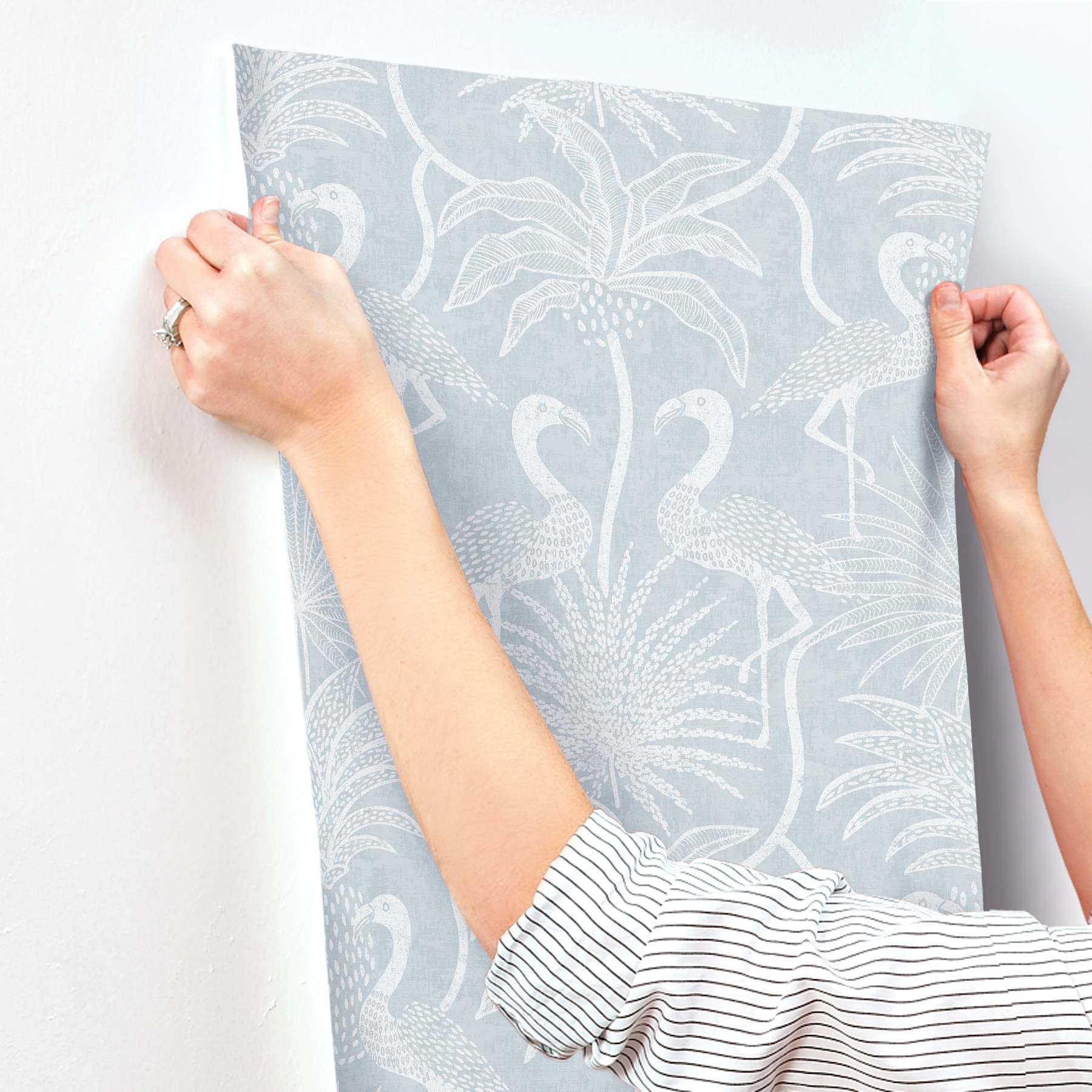 Flamingos meet up around palm trees in this delightfully whimsical tropical wallpaper. Featured here in white against sky blue. Biscayne is an unpasted, non woven wallpaper measuring 27 inches wide by 27 feet long, covering approximately 60.8 square feet per roll.