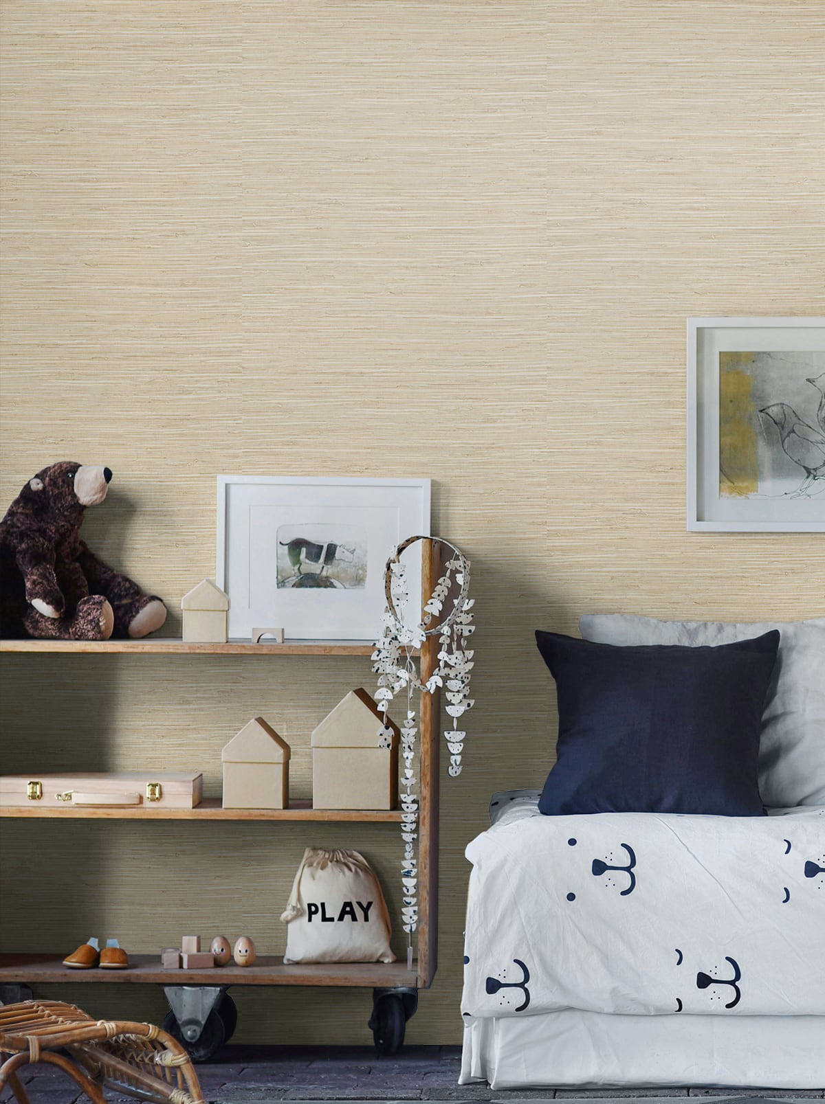 This vinyl sidewall features a satin finish in a sand dunes palette. Inspired by grasscloth and contemporary design. Perfect for residential use settings. Easy to maintain with wipe down with a damp cloth cleaning and strippable removal. Repeat: 20.87 inches. Match: Half Drop.