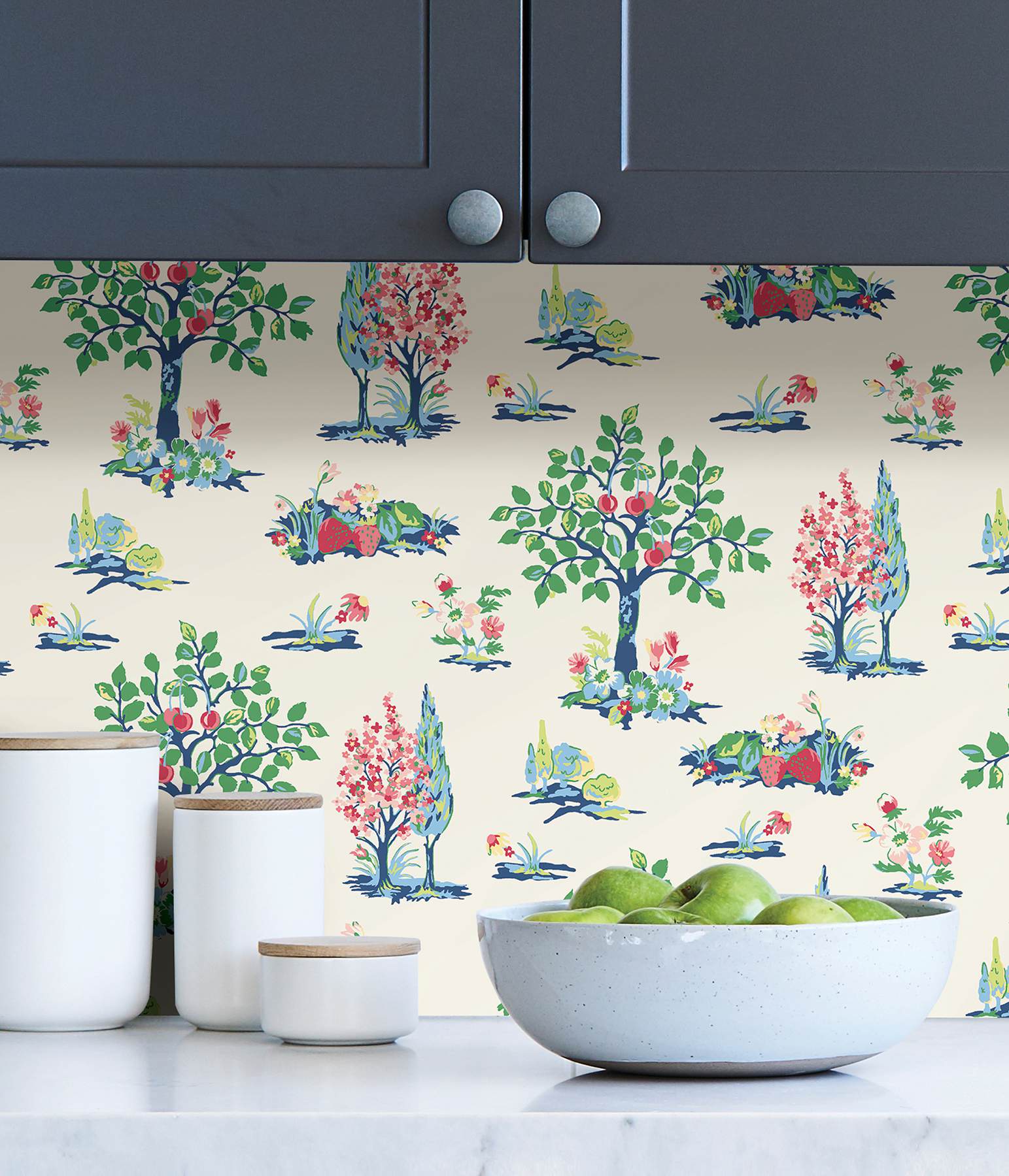 On an off-white backdrop, green, blue, yellow, and red trees and bushes are in full bloom and ready to give your walls a blissful new look. This peel and stick wallpaper by Vera Bradley would look ravishing in a powder room or entry way. About Vera Bradley: Best loved for their iconic, colorful prints, Vera Bradley has been making the world a brighter place with its handbags, travel items, accessories, and philanthropic efforts since 1982. Green Charming Grove Peel and Stick Wallpaper comes on one roll that measures 20.87 inches wide by 18 feet long.