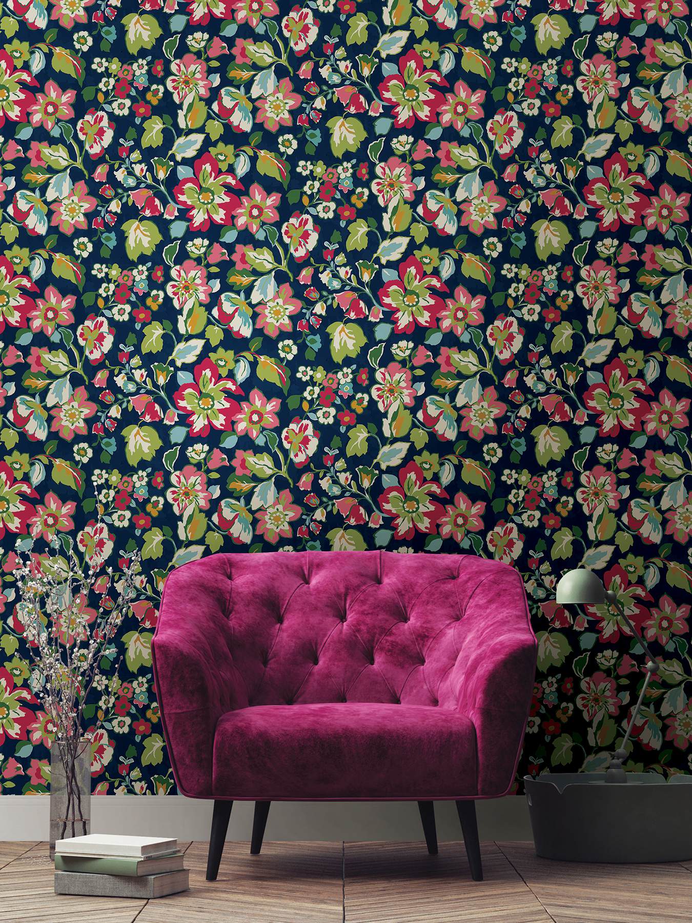 Calling all eclectic decorators - this Vera Bradley peel and stick wallpaper has your name all over it. Pinks, greens, and red florals pop on an indigo backdrop and would look perfect on any flat surface in need of a little cheer. About Vera Bradley: Best loved for their iconic, colorful prints, Vera Bradley has been making the world a brighter place with its handbags, travel items, accessories, and philanthropic efforts since 1982. Navy Sunny Garden Peel and Stick Wallpaper comes on one roll that measures 20.87 inches wide by 18 feet long.