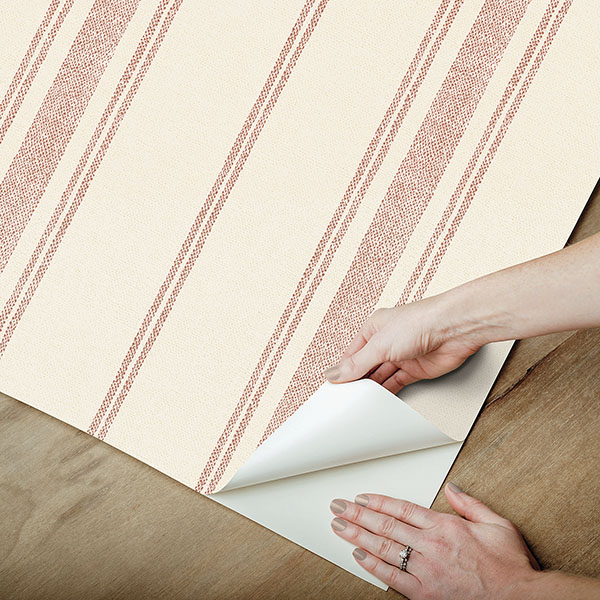 Red and cream striped peel and stick wallpaper from the Chris Loves Julia x WallPops collection of peel and stick NuWallpaper