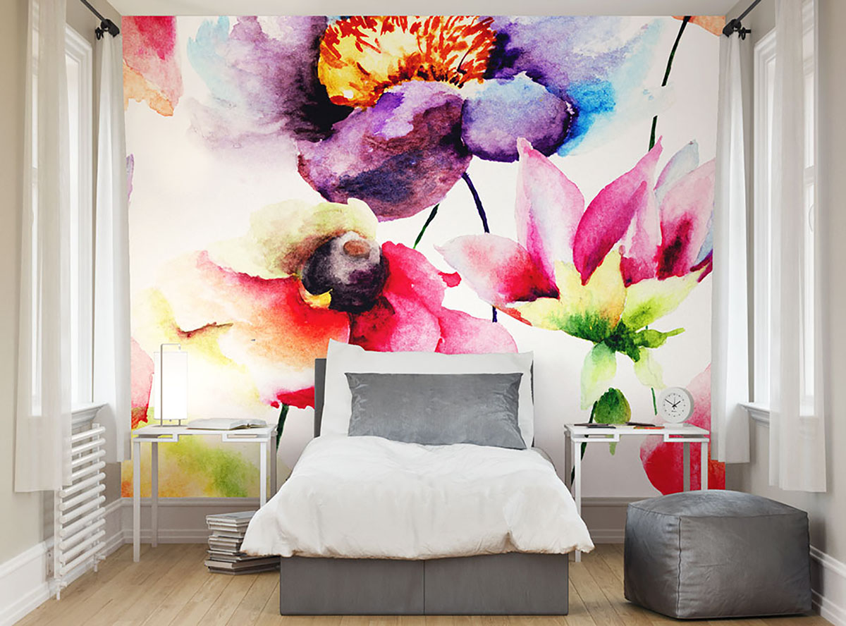 Stunning purple, pink and yellow flowers pop in this dreamy wall mural. With a watercolor style, this stunning floral mural has a contemporary feel. Watercolor Flora Wall Mural comes on 6 panels.