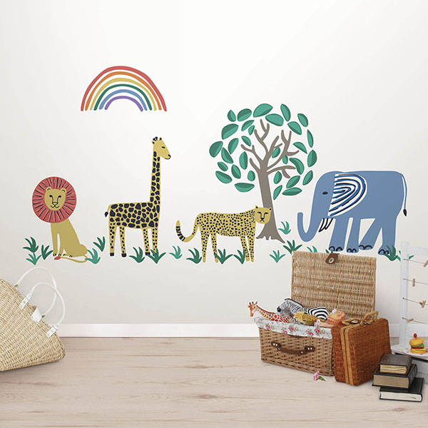 Feature: Safari wall art kit, Peel and stick, repositionable, Safe for walls: always removable and leaves no sticky residue, Sticks to most smooth, flat surfaces, Comes on two 24-in x 36-in sheets, Contains 56 pieces