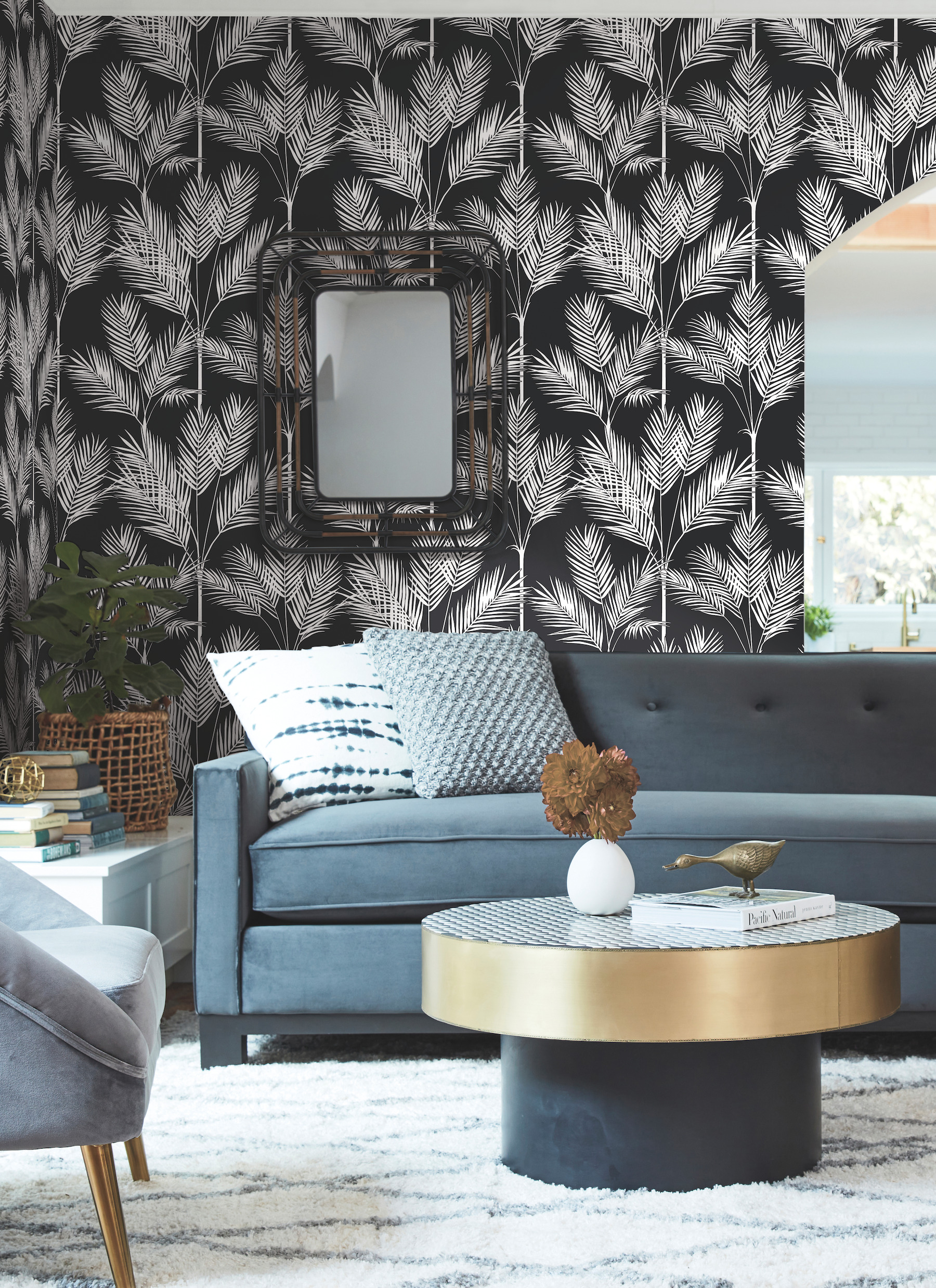The oversized fronds of the Australian palm tree inspire the textural ink silhouette of pattern King Palm. This King Palm Silhouette Wallpaper measures approximately 20.5 inches wide by 33 feet long, covering About 56.4 square feet per roll. Manufactured on Sure Strip™, a unique high performance substrate, this ultra-easy removable wallpaper is guaranteed easy to install and easy to remove; simply use water to activate. Colorway: Blue
