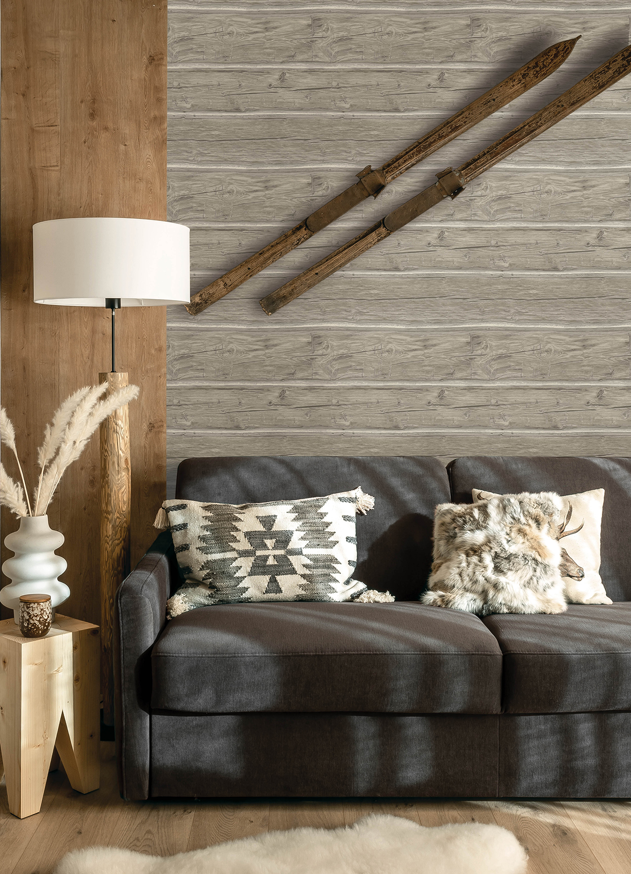 Enjoy the rugged aura of a log cabin with this wallpaper. The squared grey timbers feature irregular edges sealed with chinking, and the raw log faces furrowed with splits, knots, and other signs of wear. Lodgepole is a prepasted, non woven wallpaper measuring 20.5 inches wide by 33 feet long, covering approximately About 56.4 square feet square feet per roll.