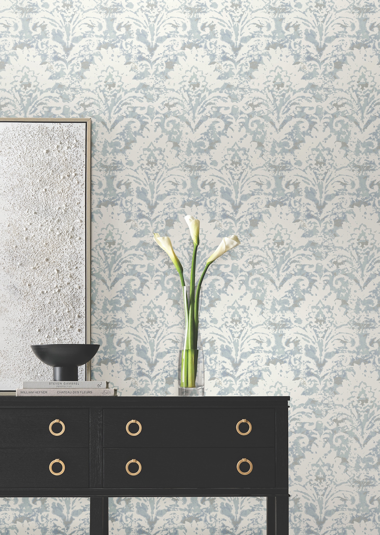 The familiar structural form of Velvet Crush Damask becomes an artistic rendering with soft edges and gentle shimmer, implying a luxurious woven tapestry with a bohemian aesthetic, featured in blue and pearlescent. This Velvet Crush Damask Wallpaper measures approximately 27 inches wide by 27 feet long, measuring approximately 60.8 square feet per roll. Candice Olson’s signature aesthetic defines timeless modern style. Decadence Second Edition features a gallery of glamorous specialty and luminous metallics dedicated to luxury living.